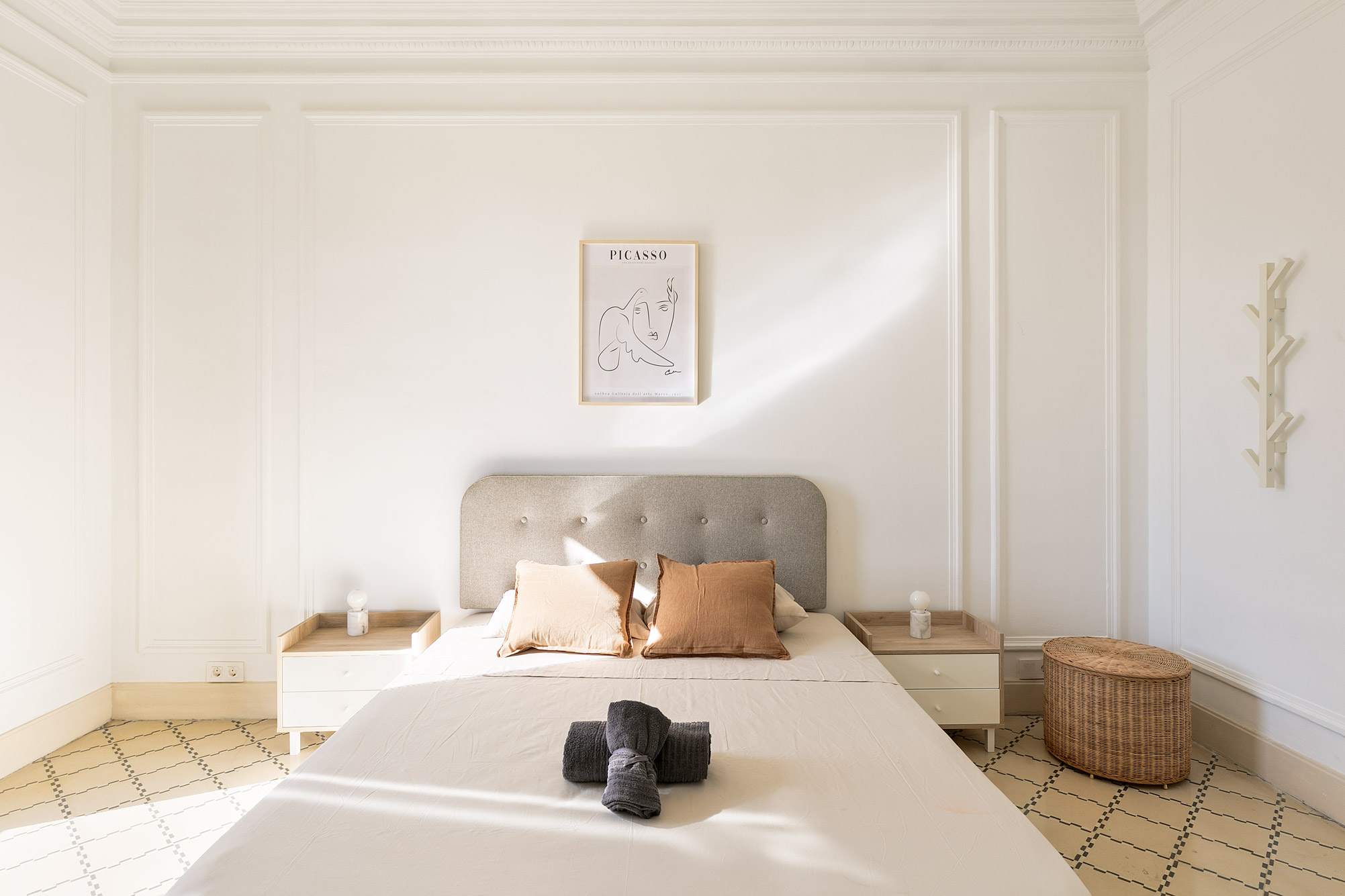 Con suelos hidráulicos clásicos del Eixample, la Habitación 1 combina elegancia y confort en un espacio amplio y luminoso. Dispone de una cama de 160×200, dos mesitas de noche con lámparas LED, un armario completo con colgador, pantalonero, zapatero y cajones, espejo de cuerpo entero y colgador adicional.