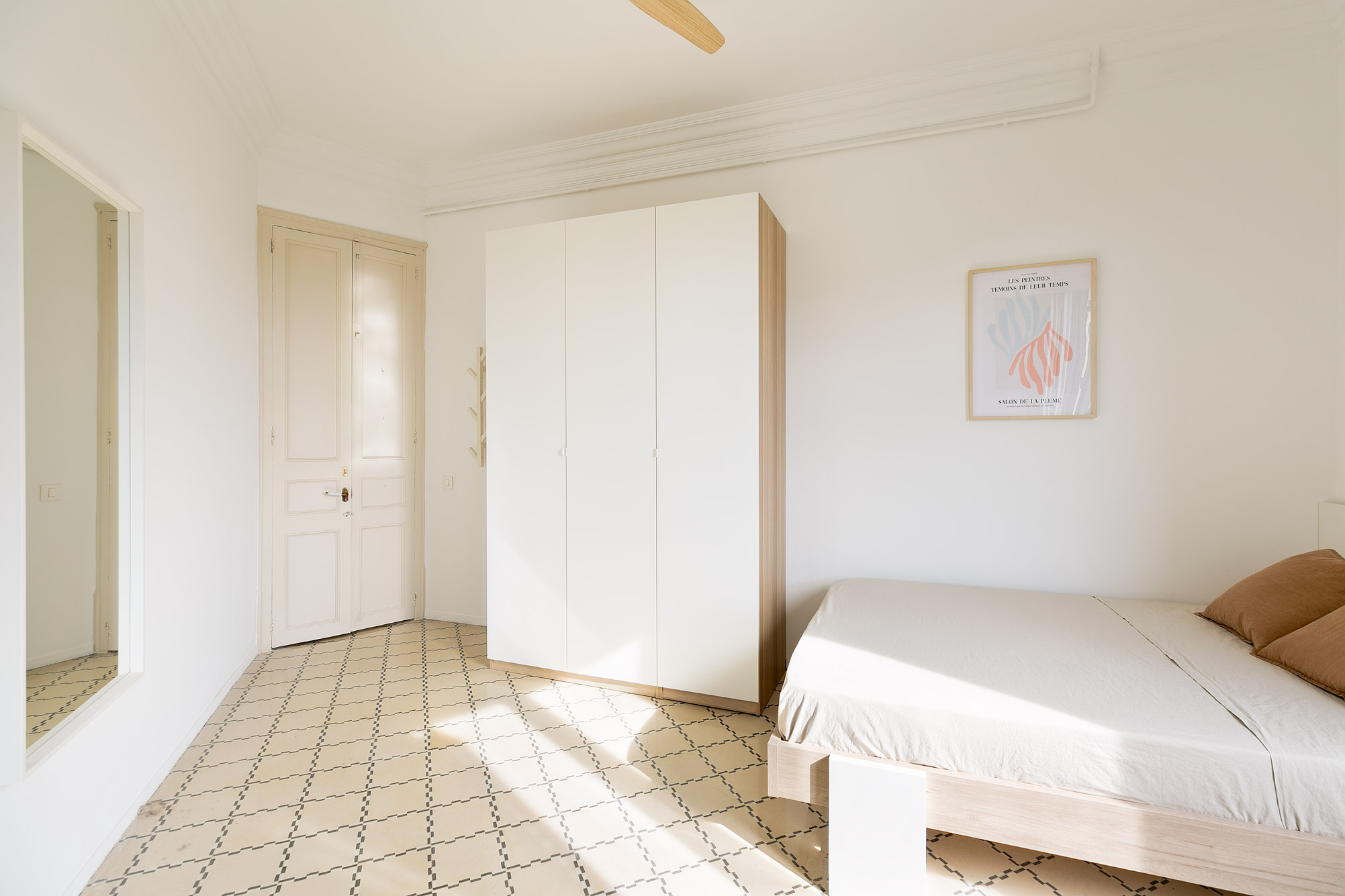 Cuenta con una cama de 140×200, mesita de noche con dos apliques LED de lectura, un amplio armario empotrado con colgador, pantalonero, zapatero y cajones, espejo de cuerpo entero y colgador adicional. El escritorio amplio con lámpara LED y cargador inalámbrico integrado ofrece un espacio perfecto para trabajar o estudiar con comodidad y tranquilidad. Para mayor confort, dispone de un ventilador de techo de madera con luz LED regulable, creando un ambiente agradable en cualquier momento del día.