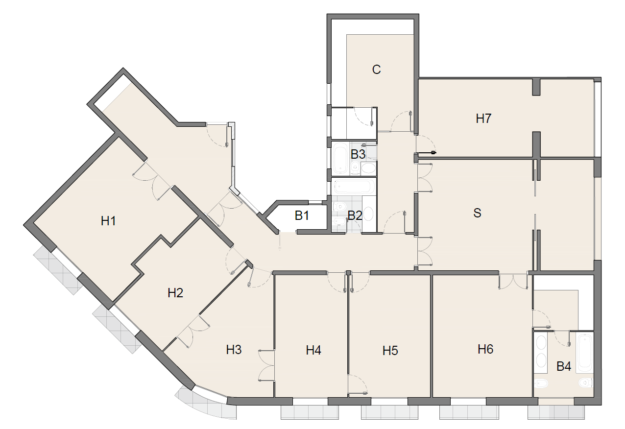 Sus 225 m² con techos altos se distribuyen en 7 habitaciones exteriores con balcón (excepto una con vistas a la Sagrada Família), 3 baños completos, y una habitación con baño en suite. La cocina es amplia, con dos neveras y una zona de lavandería independiente con dos lavadoras, y cuenta con un espacio común de armario en la entrada.