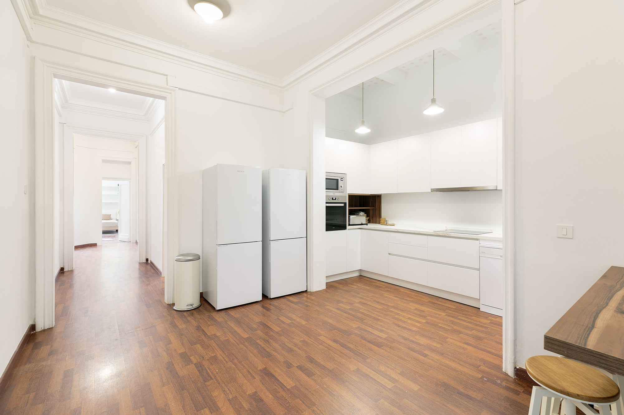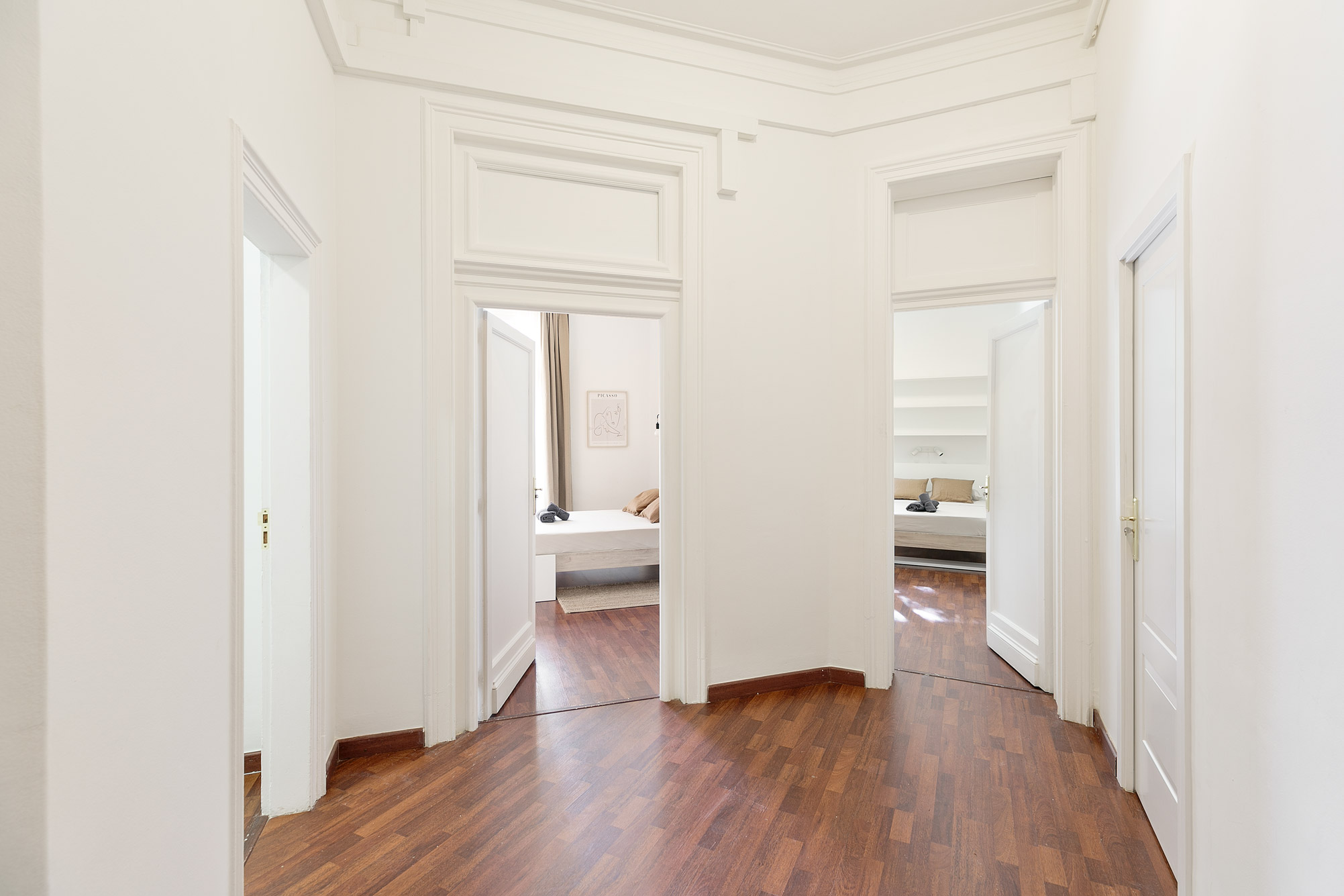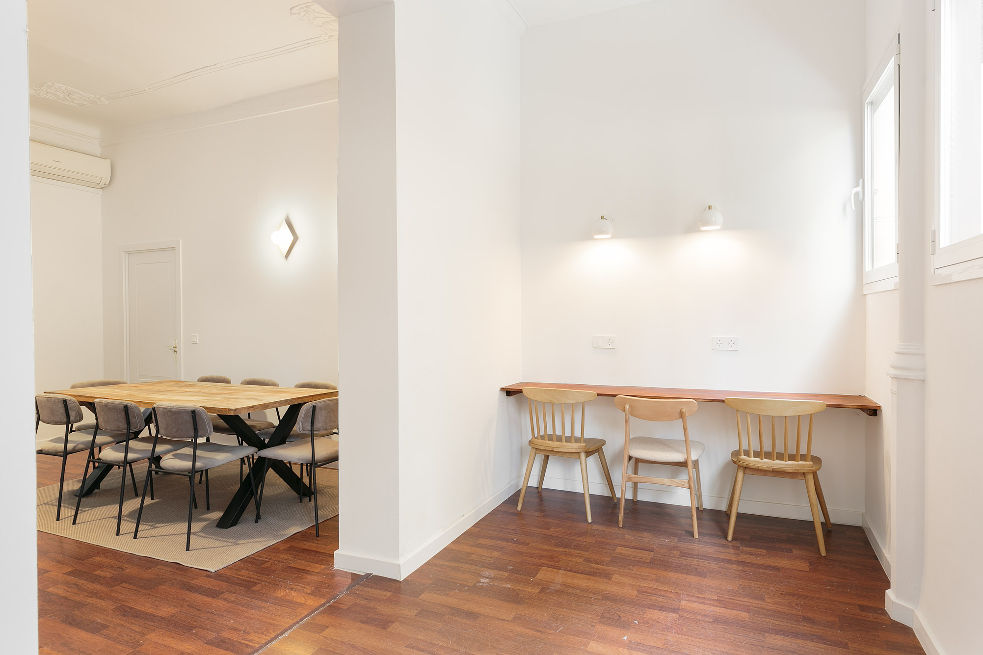 Ubicado en la primera planta de un edificio clásico del Eixample, en la esquina entre Gran Via y la calle Girona, este piso combina el encanto de la arquitectura tradicional barcelonesa con todas las comodidades del coliving moderno.