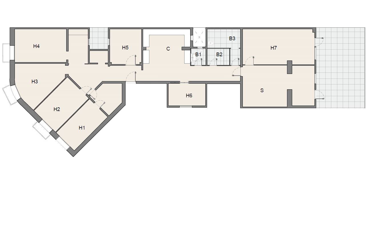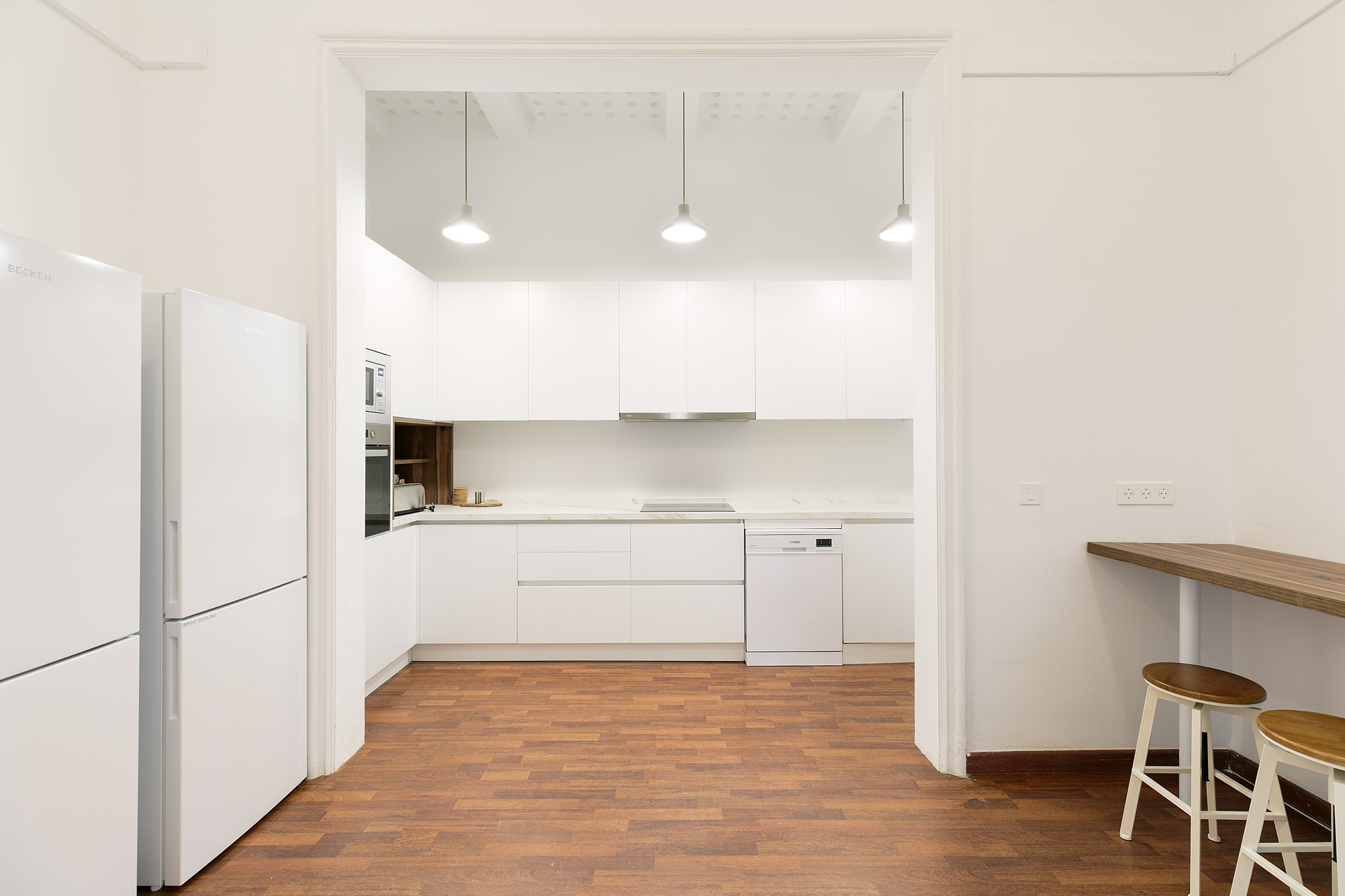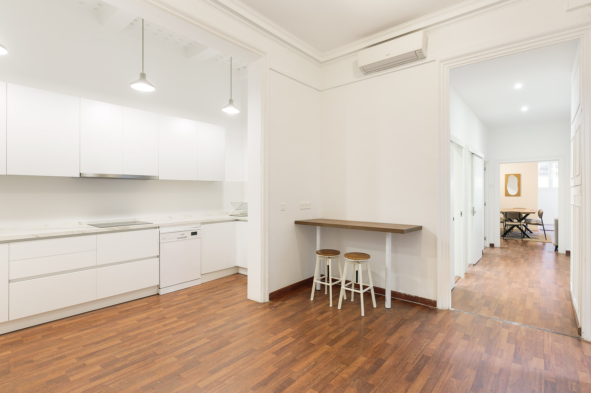 Ubicado en la primera planta de un edificio clásico del Eixample, en la esquina entre Gran Via y la calle Girona, este piso combina el encanto de la arquitectura tradicional barcelonesa con todas las comodidades del coliving moderno.