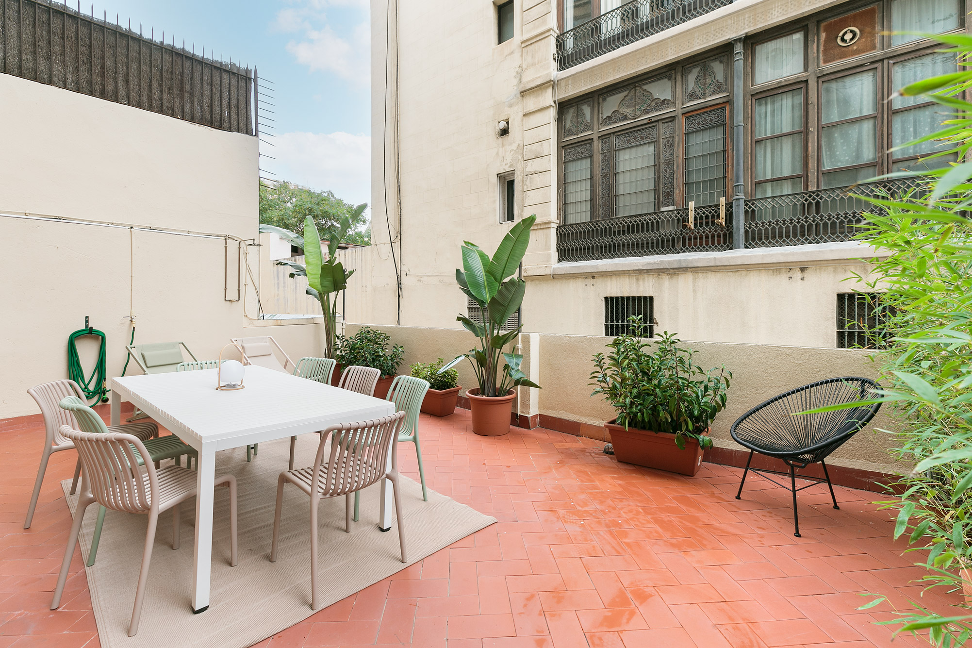 Desde el salón se accede a una gran terraza común, un verdadero oasis urbano con mesa para comer al aire libre, hamacas y zona de ducha, ideal para tomar el sol, leer o relajarte durante los días de verano.