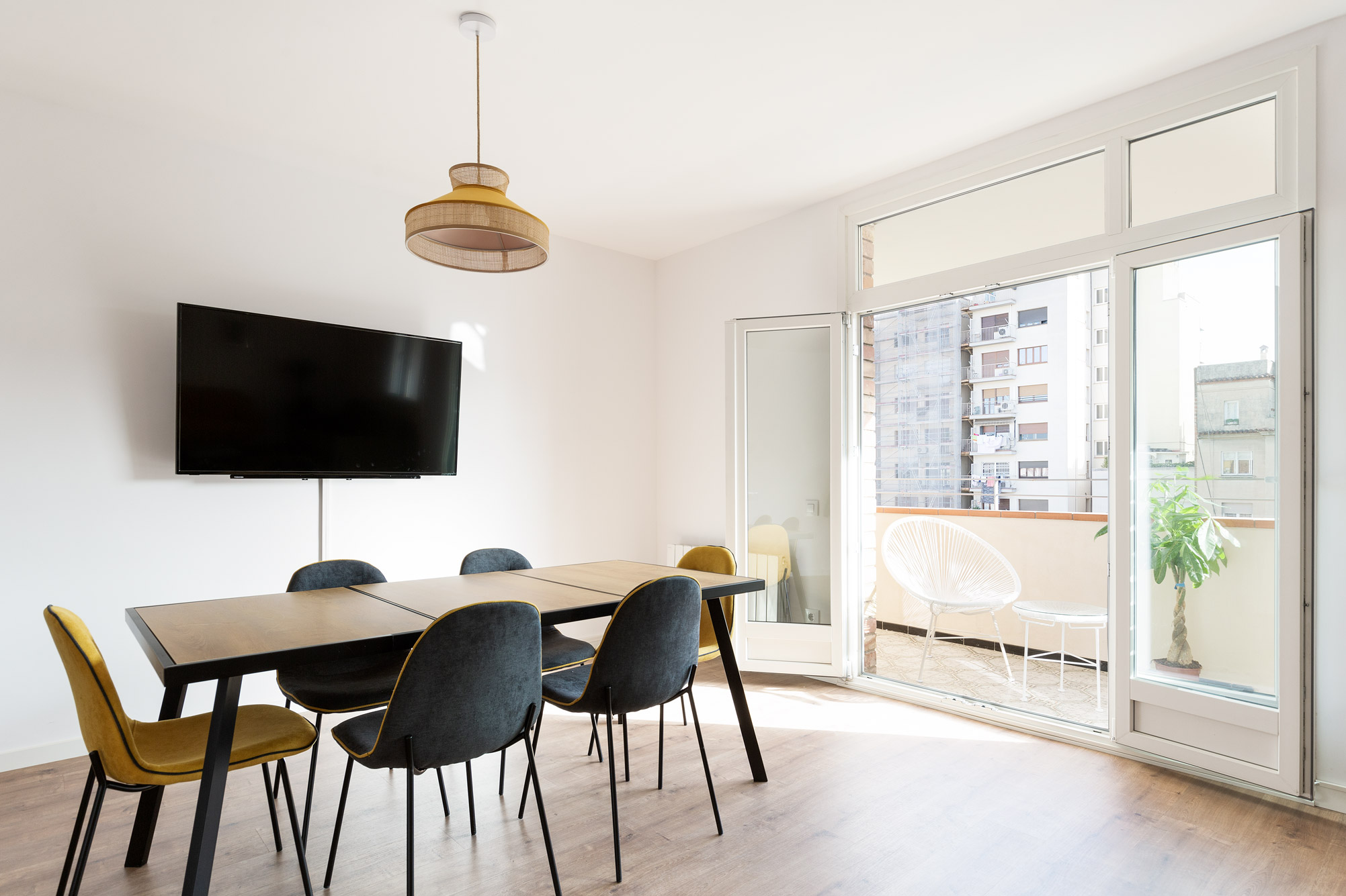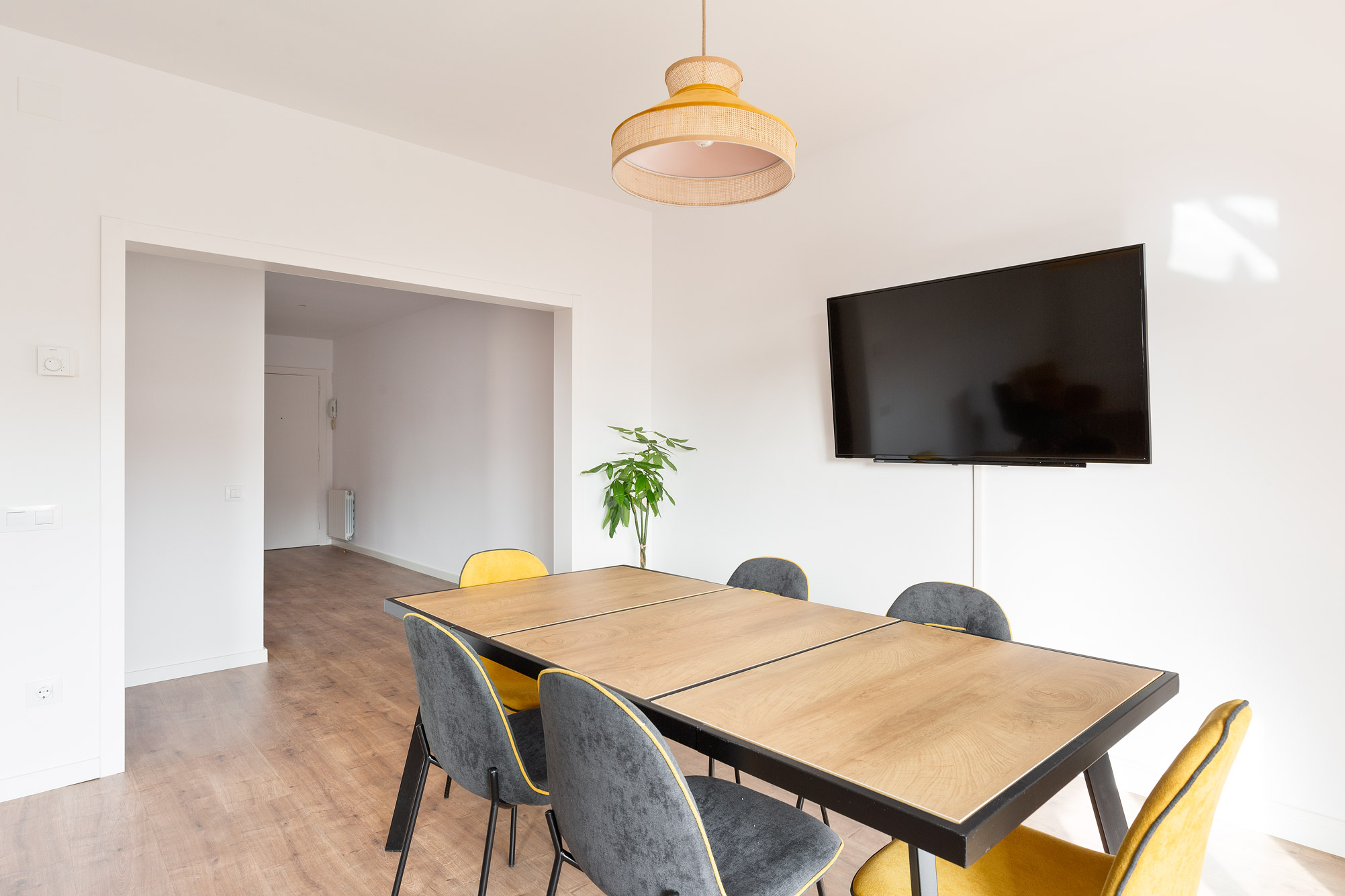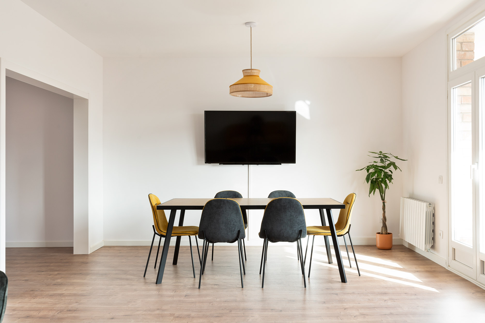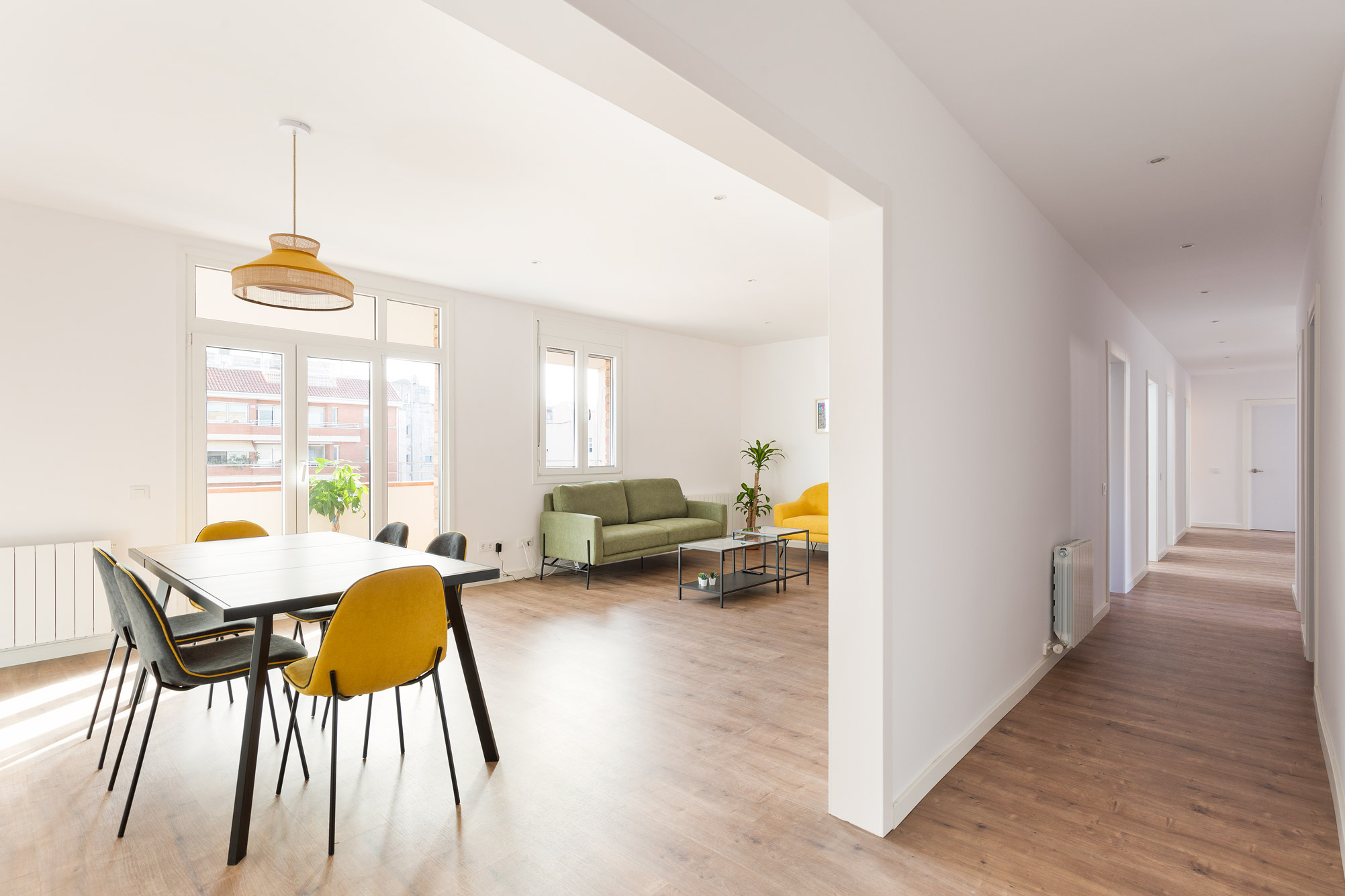 Se distribuye en seis habitaciones, todas con iluminación natural, ventiladores de techo y ventanas de doble cristal que garantizan silencio y confort. Las habitaciones dan a la parte trasera del edificio, donde se abre el clásico patio del Eixample, lleno de calma y luminosidad.