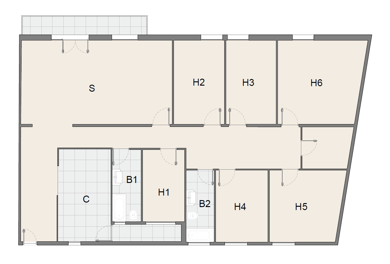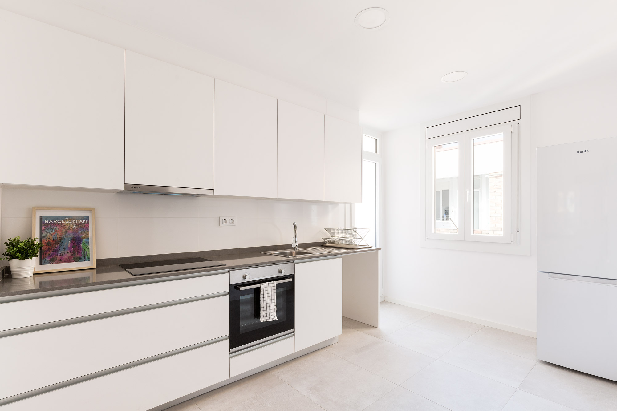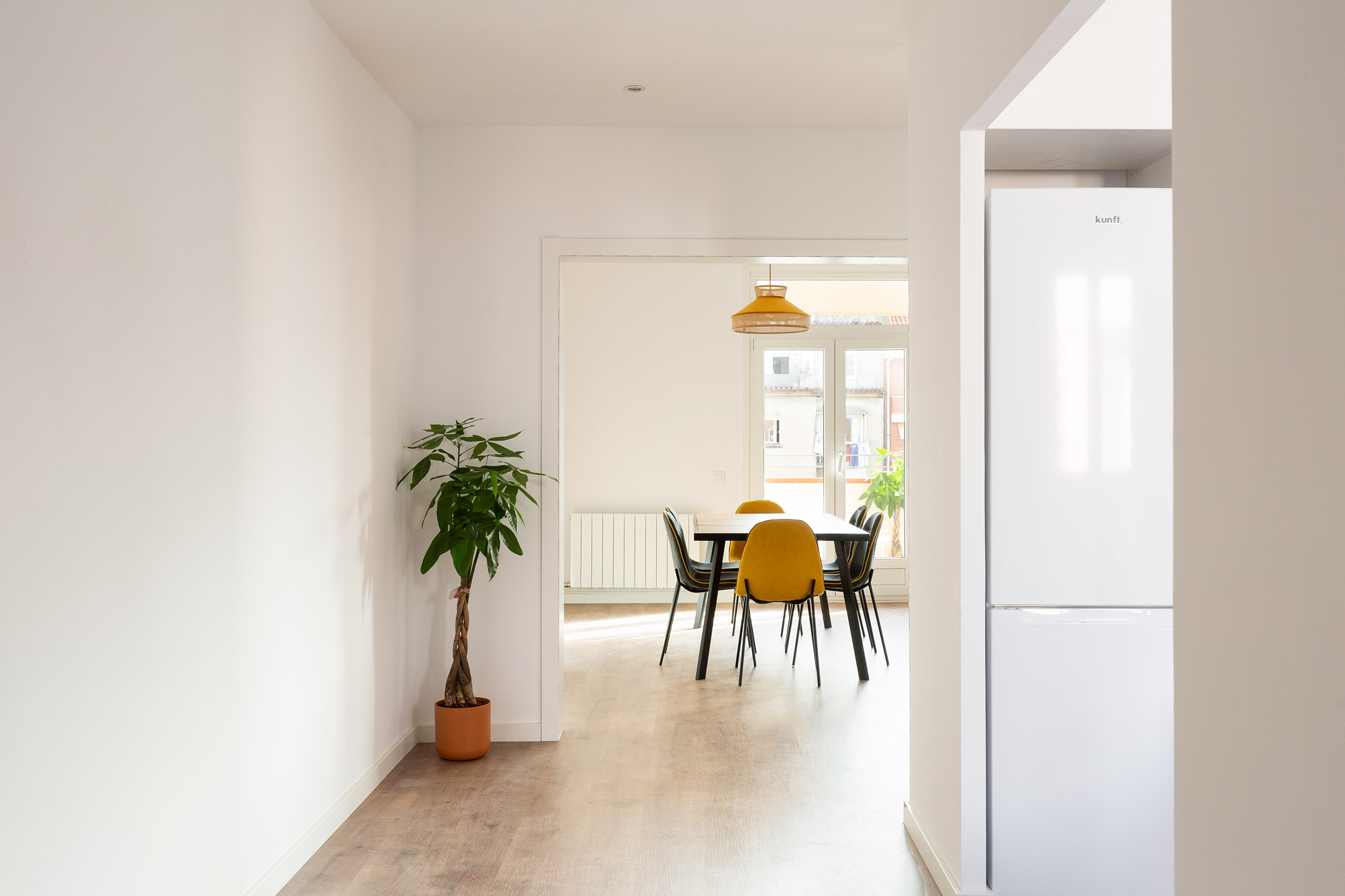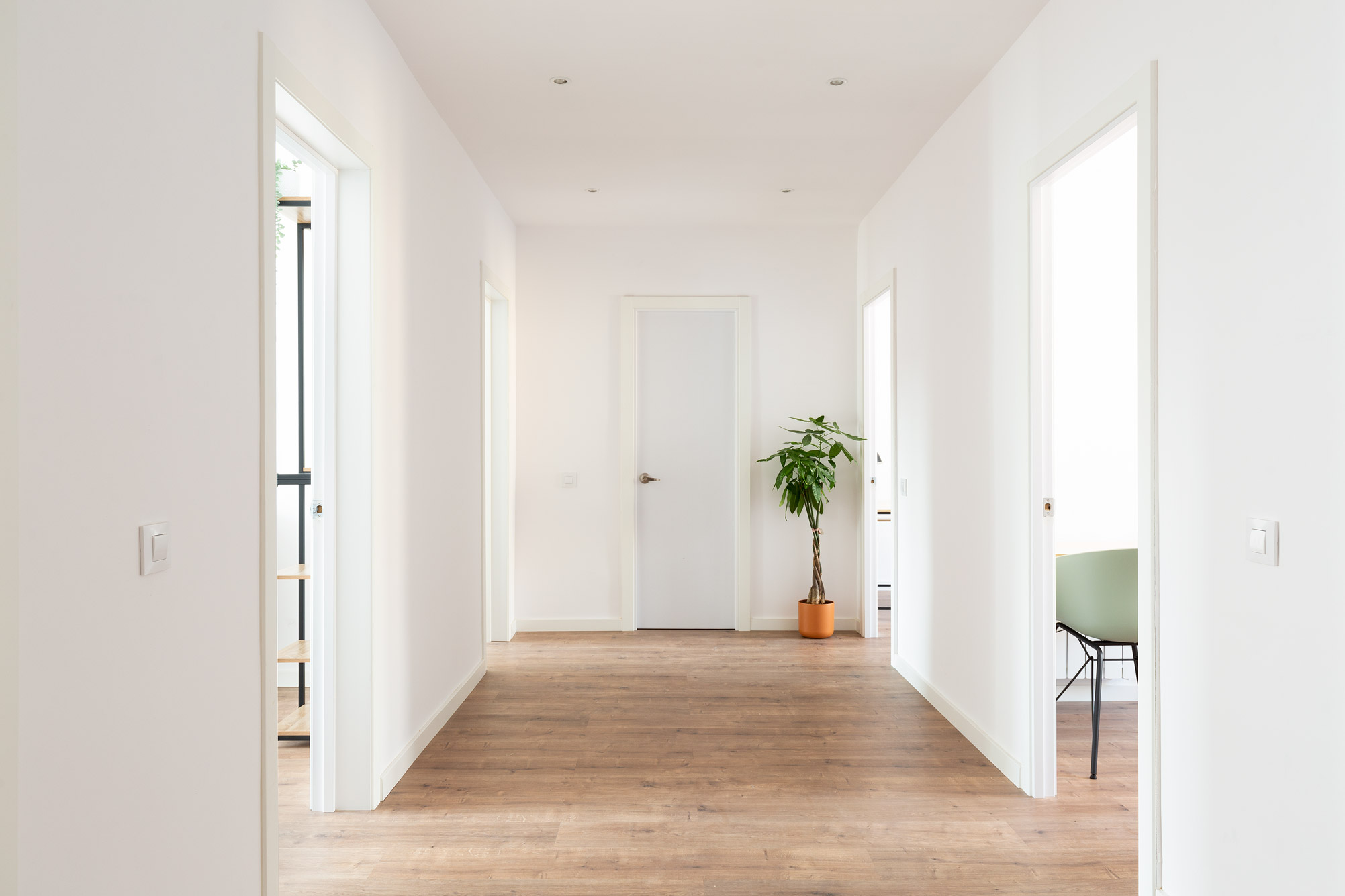 La vivienda ofrece una luz espectacular durante todo el día, creando un ambiente cálido y relajado. Se distribuye en seis habitaciones, todas con iluminación natural, ventiladores de techo y ventanas de doble cristal que garantizan silencio y confort. Las estancias se orientan hacia la parte trasera del edificio, donde se abre el típico patio interior del Eixample, lleno de calma y luminosidad.